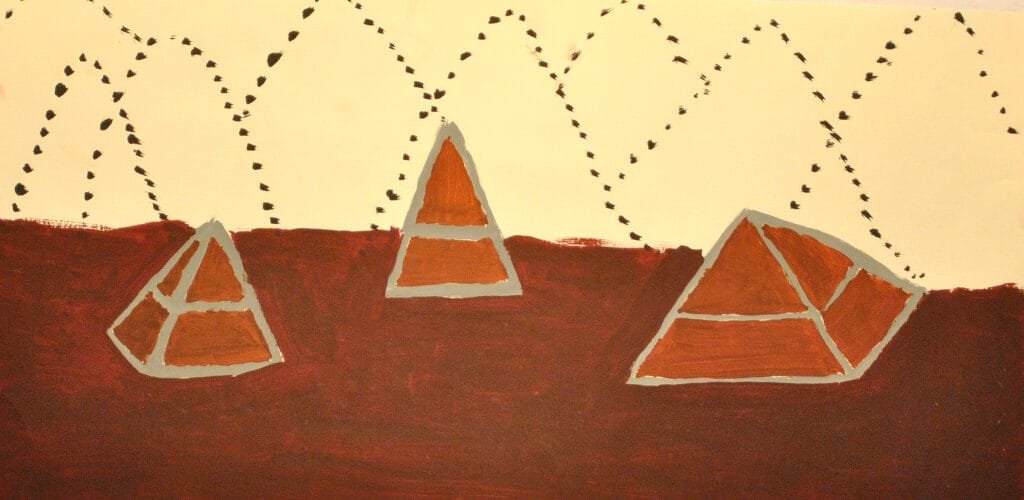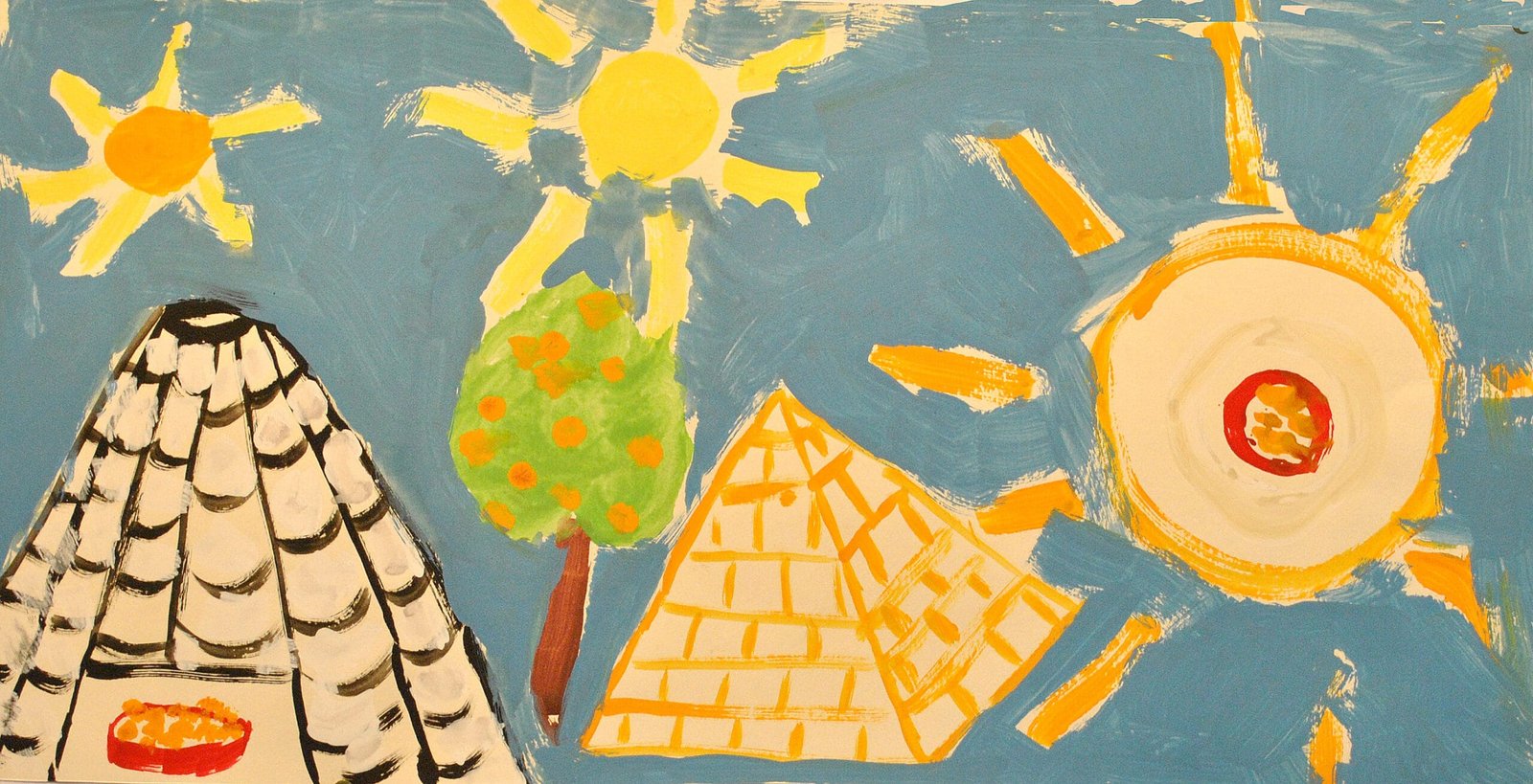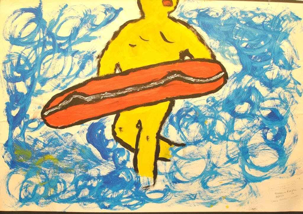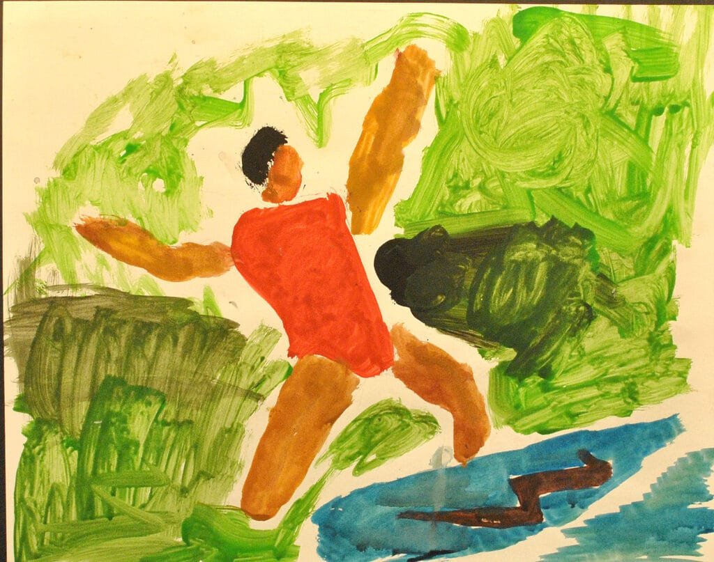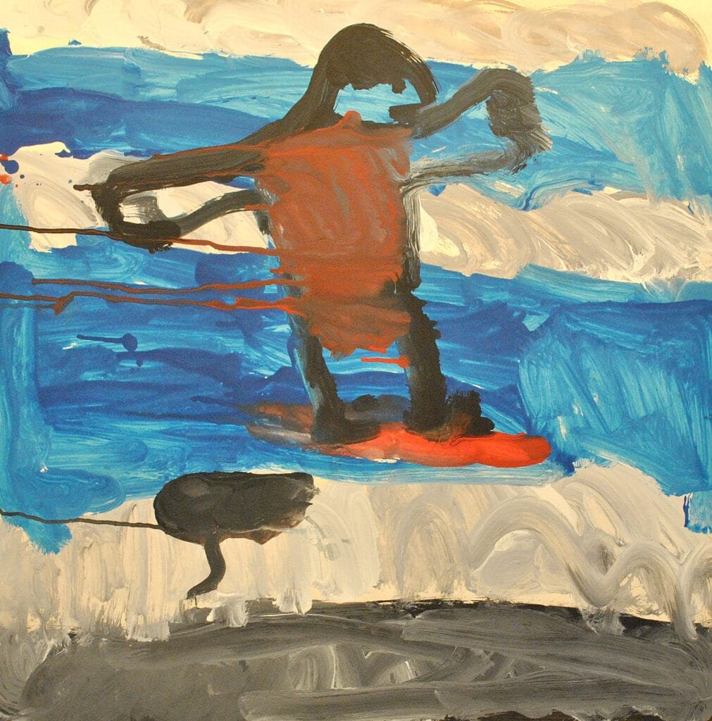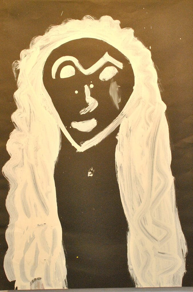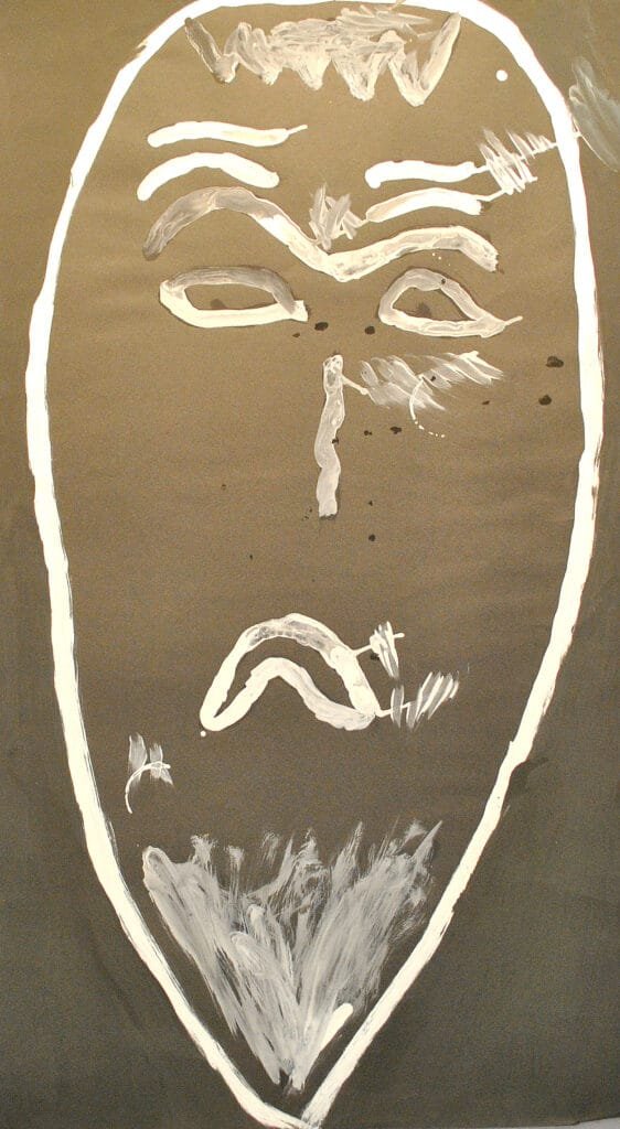 A partir desse registro rápido os alunos trabalhavam esse segmento da obra de Karel Appel com tinta guache explorando as misturas de cor e as diferentes marcas do pincel.
